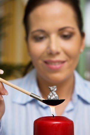 Das Schmelzgut wird auf den Löffel gegeben, über die Flamme gehalten bis es schmilzt und dann ganz schnell in das kalte Wasser geworfen. Dabei formt sich das Schmelzgut zu ganz verschiedenen, vielfach sehr bizarren Figuren. Die gegossene Figur wird dann aus der Wasserschale genommen und gedeutet.